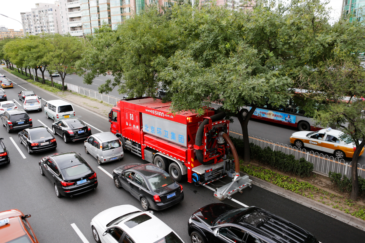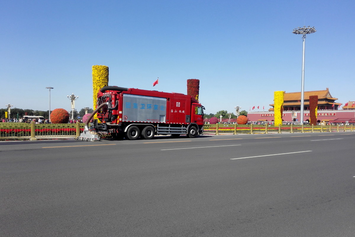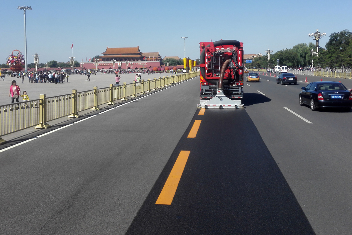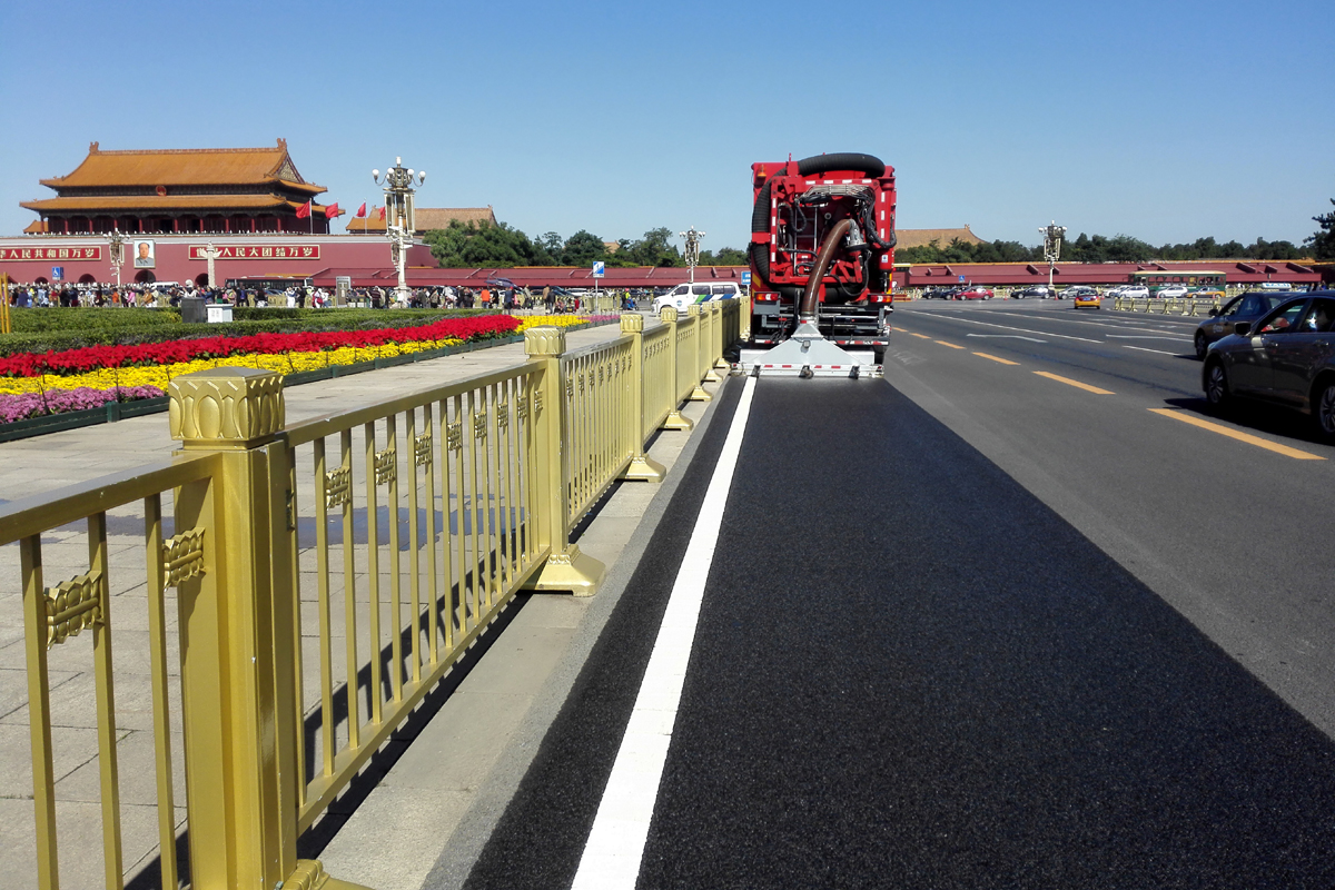 北京市天安門廣場、二環(huán)線、三環(huán)線、長安街等主干道路面的深度清潔施工,經(jīng)過清理的路面顯露出了路面鋪設(shè)之初的本色,縫隙可見,標(biāo)線清晰,與只經(jīng)過普通機掃的路面形成鮮明對比,此次大范圍清潔之后,使得城區(qū)主干道更干凈,還北京一片藍天。