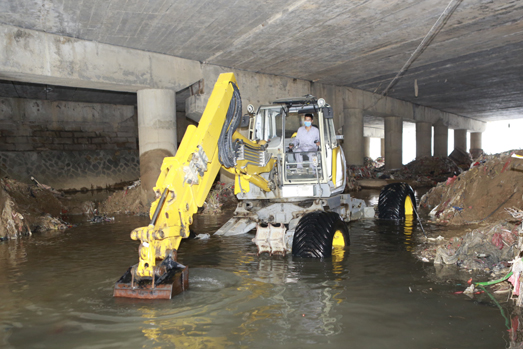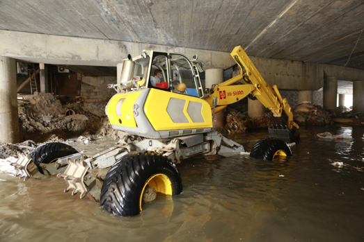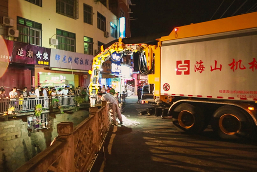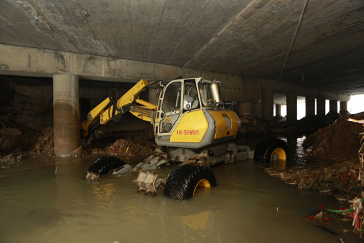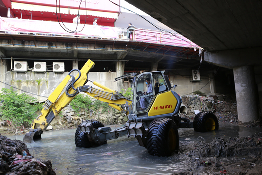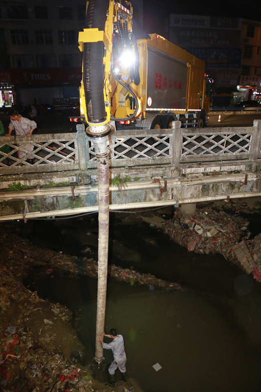 在第14號臺風“莫蘭蒂”來臨之際,海山機械緊急出動高端應急救援裝備——非破壞性挖掘抽吸車和步履工作平臺趕赴仙游郊尾鎮(zhèn),對一座大橋下堵塞嚴重的河道進行清理。本次施工運用抽吸車和步履工作平臺聯(lián)合作業(yè),發(fā)揮抽吸車長距離作業(yè)、強力抽吸和步履的機動靈活、全地形通過、“上山下河”特點,解決了普通機械設備無法進入河道和清理出來的垃圾物無法運輸?shù)碾y題。經(jīng)過設備的緊急挖掘、抽吸疏通,使堵塞嚴重的河道保持暢通,確保暴雨來臨時河道水流暢通。