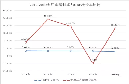 圖1 2015~2019專用車產量增長率與GDP增長率比較