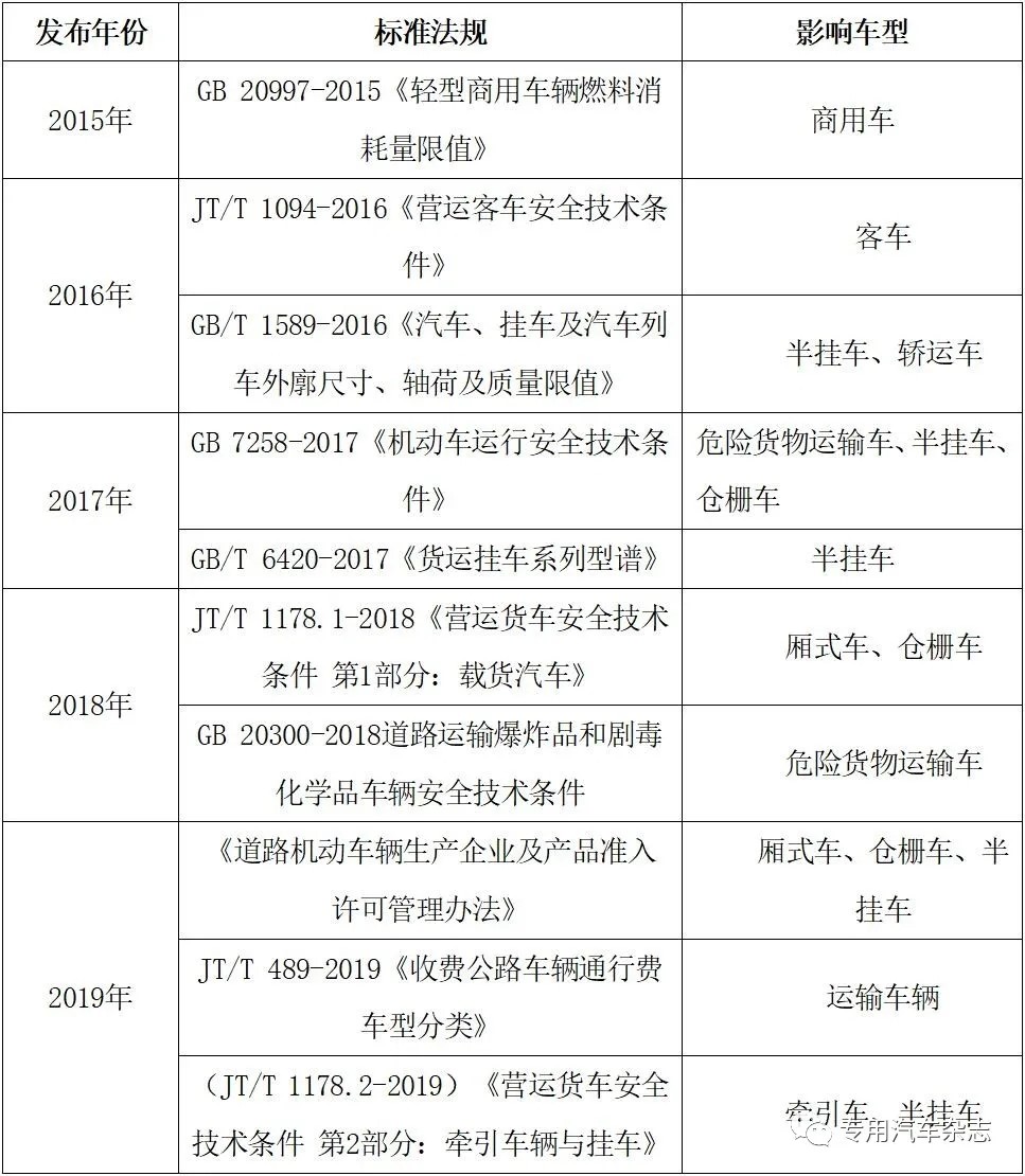 “十三五”期間,國家相關政策及標準相繼發(fā)布及修訂(見表1),從標準法規(guī)的角度淘汰了部分嚴重影響運輸安全的車型,也催生了不少行業(yè)新產品。
