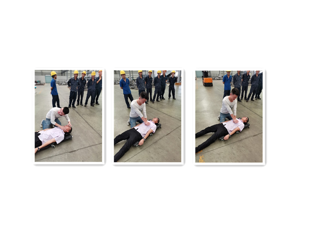 2、2021年7月26日上午10:00分左右,制造部車間員工XXX在作業(yè)過程中突然出現(xiàn)中暑現(xiàn)象,現(xiàn)場(chǎng)應(yīng)急人員立即將中暑人員轉(zhuǎn)移到陰涼通風(fēng)處,并讓病人平臥,解開衣扣,松開或脫去衣服,按摩軀干和四肢的皮膚肌肉,加速外圍血液循環(huán),促進(jìn)散熱(或用冷水或用冰袋置于病人的頭、頸、腋下、腹股溝等處,或用酒精擦拭病人的頭、頸、腋下、腹股溝等處進(jìn)行散熱)。針對(duì)重度中暑者,在采取上述措施的同時(shí),立即撥打120,將患者迅速送往有條件的大醫(yī)院急診科治療。一旦發(fā)現(xiàn)病人呼吸、心跳停止應(yīng)立即進(jìn)行心肺復(fù)蘇。中暑急救演練、人工呼吸及胸外心臟按壓法演練圖片如下: